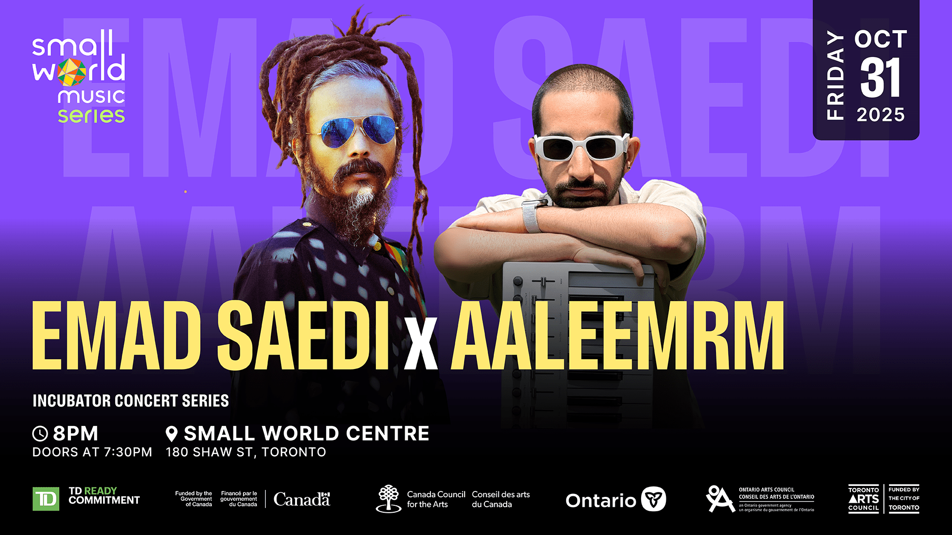 The 2025 Small World Music Series is sponsored by TD Bank Group through the TD Ready Commitment and funded by the Government of Canada, Canada Council for the Arts, Ontario Arts Council, and the City of Toronto through the Toronto Arts Council.