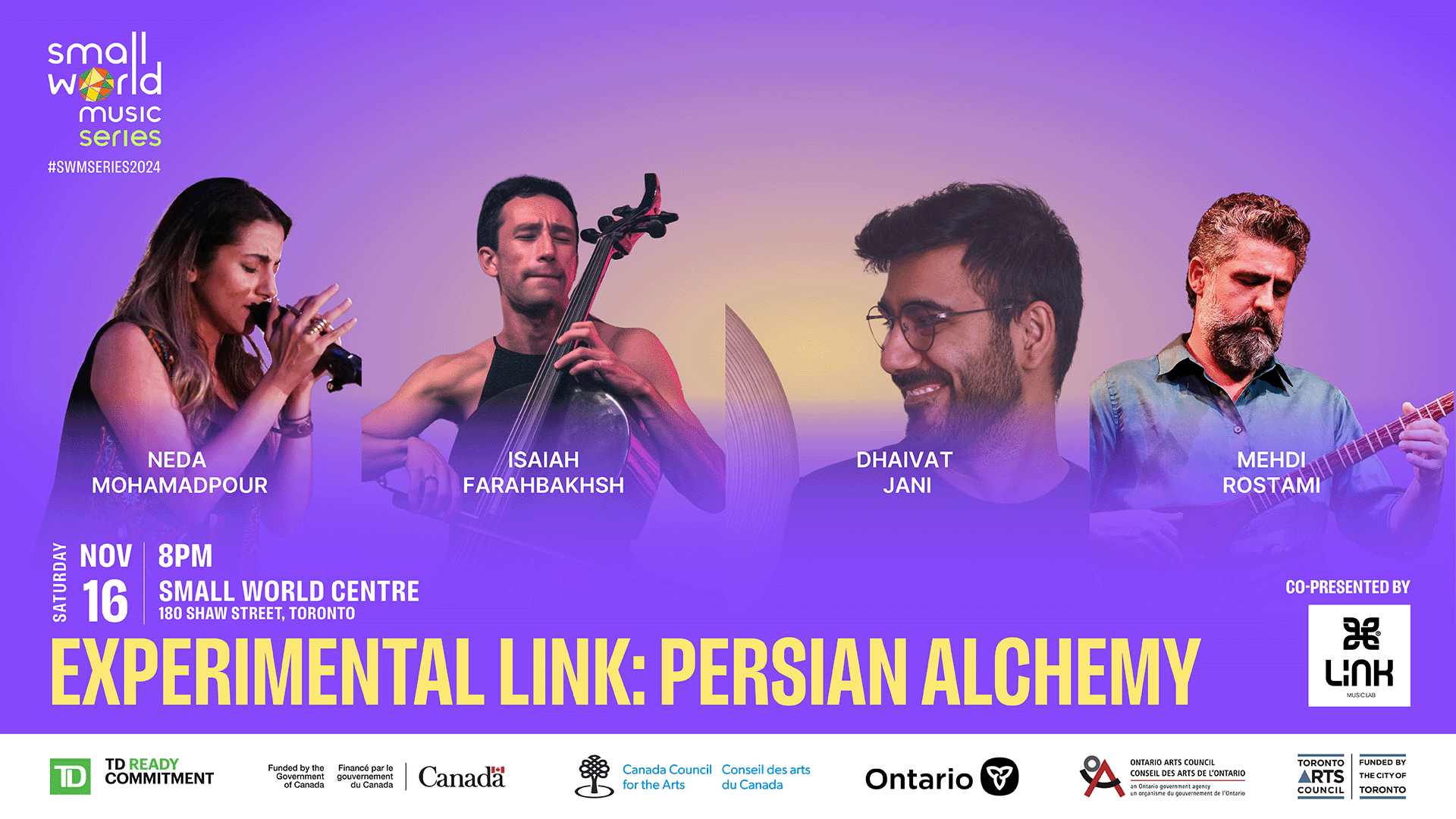 The 2024 Small World Music Series is sponsored by TD Bank Group through the TD Ready Commitment and funded by the Government of Canada, Canada Council for the Arts, Ontario Arts Council, and the City of Toronto through the Toronto Arts Council.