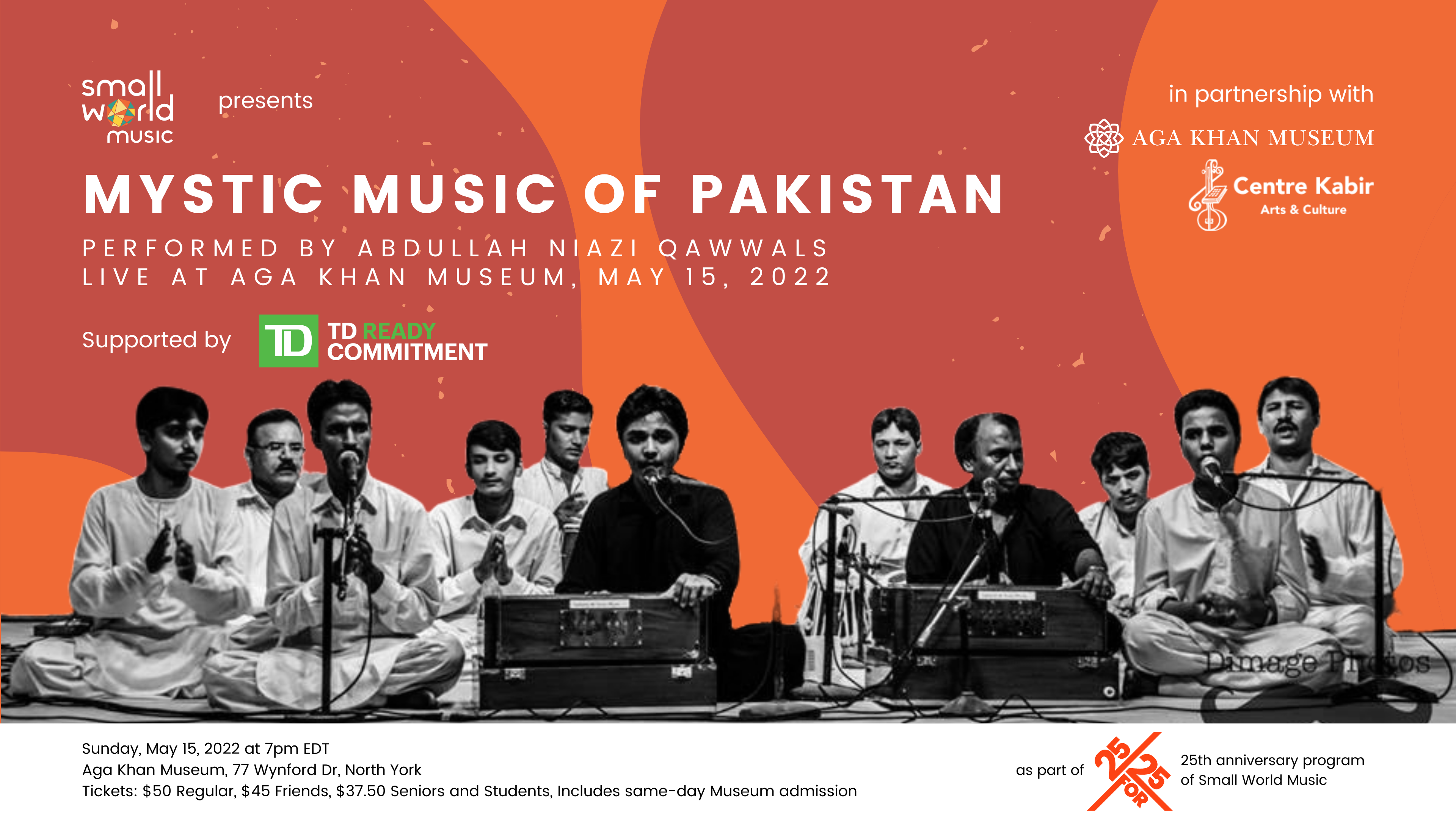 Small World Music, in partnership with Kabir Cultural Centre, and Aga Khan Museum, presents an evening of Sufi Music in the form of Qawwali performed by Abdullah Niazi Qawwals from Pakistan. Qawwali is a form of devotional singing, originating from the Indian subcontinent, and notably popular in the Punjab and Sindh regions of Pakistan; in Hyderabad, Delhi and other parts of India, especially north; as well as the Dhaka and Chittagong Divisions of Bangladesh.